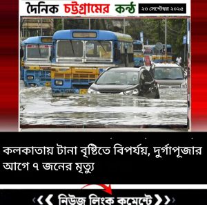 দুর্গাপূজার আগে টানা বৃষ্টিতে বিপর্যস্ত হয়ে পড়েছে কলকাতা ও আশপাশের শহর। টানা ভারী বৃষ্টির জেরে এখন পর্যন্ত ৭ জনের মৃত্যুর খবর পাওয়া গেছে। সোমবার রাতভর প্রবল বর্ষণের ফলে শহরের বহু এলাকায় জলাবদ্ধতা তৈরি হয়েছে, ভোগান্তিতে পড়েছেন সাধারণ মানুষ।