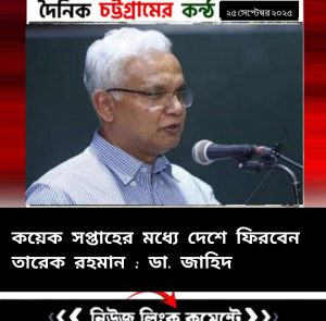 বিএনপির স্থায়ী কমিটির সদস্য ডা. এ জেড এম জাহিদ হোসেন বলেছেন, ‘কয়েক সপ্তাহের মধ্যে দেশে ফিরবেন তারেক রহমান। দেশে ফিরে শুধু বিএনপি নয়, গণতন্ত্র যাত্রার নেতৃত্ব দেবেন তিনি।’