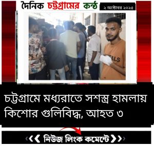 চট্টগ্রামের সদরঘাটের পূর্ব মাদারবাড়ি এলাকায় মধ্যরাতে সশস্ত্র হামলায় এক কিশোর গুলিবিদ্ধসহ চারজন আহত হয়েছেন।