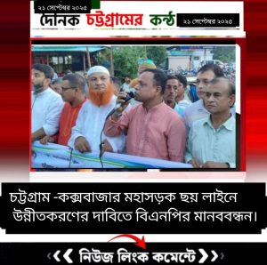 চট্টগ্রাম -কক্সবাজার মহাসড়ক ছয় লাইনে উন্নীতকরণের দাবিতে বিএনপির মানববন্ধন।