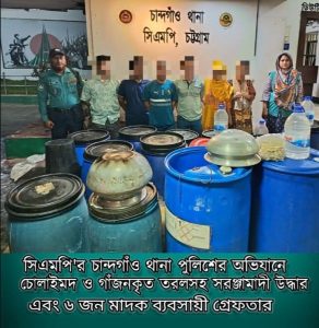 নিজস্ব প্রতিবেদক, চট্টগ্রাম চট্টগ্রাম মেট্রোপলিটন পুলিশের (সিএমপি) চান্দগাঁও থানা পুলিশের অভিযানে একটি বড় ধরনের চোলাইমদ তৈরির কারখানার সন্ধান পাওয়া গেছে। অভিযানে ৫১০ লিটার তৈরি মদ এবং ১০০০ লিটার কাঁচামালসহ ৬ জন মাদক ব্যবসায়ীকে গ্রেফতার করা হয়েছে।