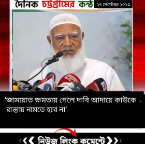 বাংলাদেশ জামায়াতে ইসলামী ক্ষমতায় গেলে জনগণকে দাবি আদায়ে আর রাস্তায় নামতে হবে না বলে মন্তব্য করেছেন দলটির আমির ডা. শফিকুর রহমান।