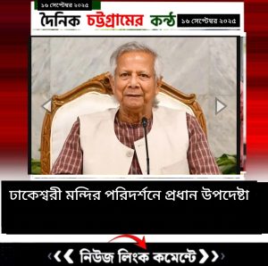 ঢাকেশ্বরী জাতীয় মন্দির পরিদর্শন করেছেন অন্তর্বর্তী সরকারের প্রধান উপদেষ্টা ড. মুহাম্মদ ইউনূস। মঙ্গলবার (১৬ সেপ্টেম্বর) সকালে মন্দির পরিদর্শনে যান তিনি। প্রধান উপদেষ্টার সিনিয়র সহকারী প্রেস সচিব ফয়েজ আহম্মদ বিষয়টি নিশ্চিত করেছেন।