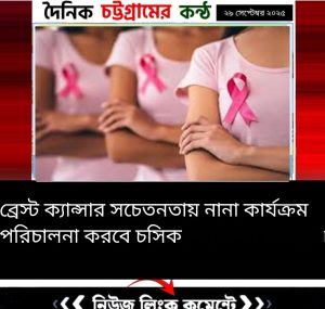 অক্টোবর মাসজুড়ে চট্টগ্রামে পালিত হবে ব্রেস্ট ক্যান্সার সচেতনতা মাস। এই উপলক্ষে চট্টগ্রাম সিটি কর্পোরেশনের সঙ্গে সম্পৃক্ত হয়েছে সিএসসিআর এবং পিজিএস একাডেমিয়া।