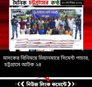 মিয়ানমারে মাদকের বিনিময়ে বাংলাদেশ থেকে বিপুল পরিমাণ সিমেন্ট পাচারের সময় ২৪ জন পাচারকারীকে আটক করেছে বাংলাদেশ কোস্ট গার্ড।