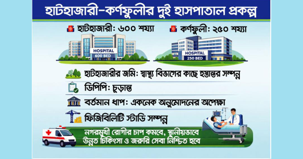 চট্টগ্রামের উত্তর ও দক্ষিণাঞ্চলের মানুষের জন্য আধুনিক স্বাস্থ্যসেবার দ্বার খুলতে বাস্তবায়নের চূড়ান্ত ধাপে পৌঁছেছে হাটহাজারী ও কর্ণফুলীতে প্রস্তাবিত দুই বৃহৎ হাসপাতাল প্রকল্প। হাটহাজারীতে ৬০০ শয্যার জেনারেল হাসপাতাল ও নার্সিং ইনস্টিটিউটসহ স্বাস্থ্য ব্যবস্থাপনা প্রশিক্ষণ কেন্দ্র এবং কর্ণফুলীতে ২৫০ শয্যার জেনারেল হাসপাতাল নির্মাণের প্রকল্পের ডেভেলপমেন্ট প্রজেক্ট প্রপোজাল (ডিপিপি) ইতোমধ্যে চ‚ড়ান্ত হয়েছে। প্রকল্প দুটি এখন একনেক সভায় অনুমোদনের জন্য প্রস্তুত।